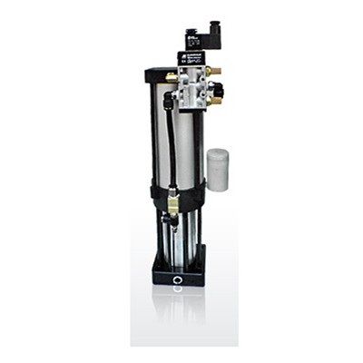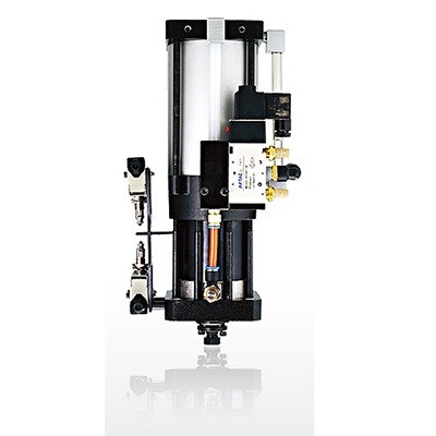 1、預(yù)壓式增壓缸:當(dāng)工作氣壓壓在液壓油表面時,液壓油會因壓縮空氣作用而流向預(yù)壓行程腔,此時液壓油會迅速推動軸心作位移,當(dāng)工作位移遇到的阻力大于氣壓壓力時預(yù)壓軸心則停止動作,此時,增壓缸的增壓段因為氣動壓力動作,增壓軸心亦開始作位移動作,并擠壓預(yù)壓缸體里的低壓油,使之增壓從而產(chǎn)生強大推力的效果。